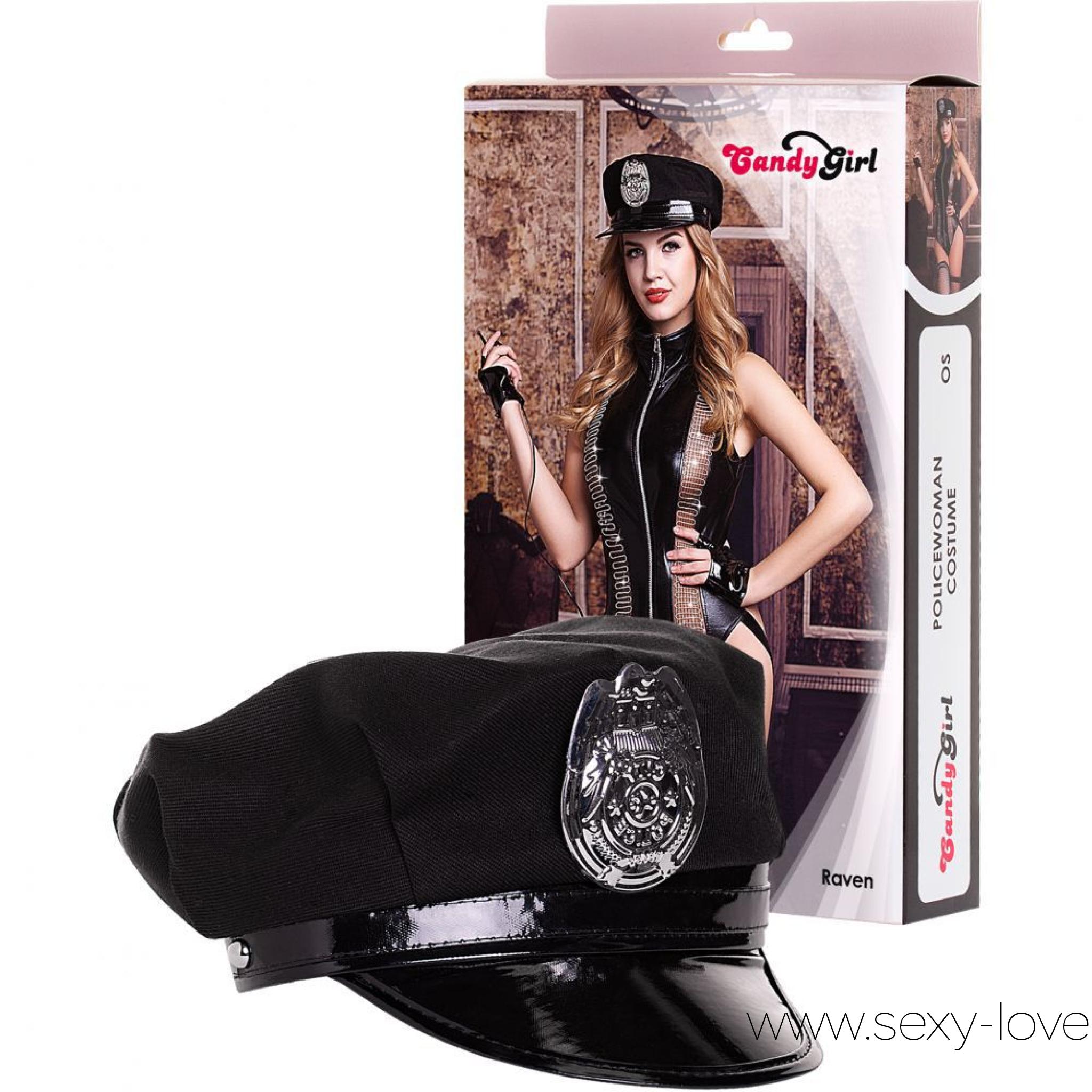 Костюм полицейской «Raven» из боди, головного убора, митенок, подвязок, чулок и рации, цвет черный,