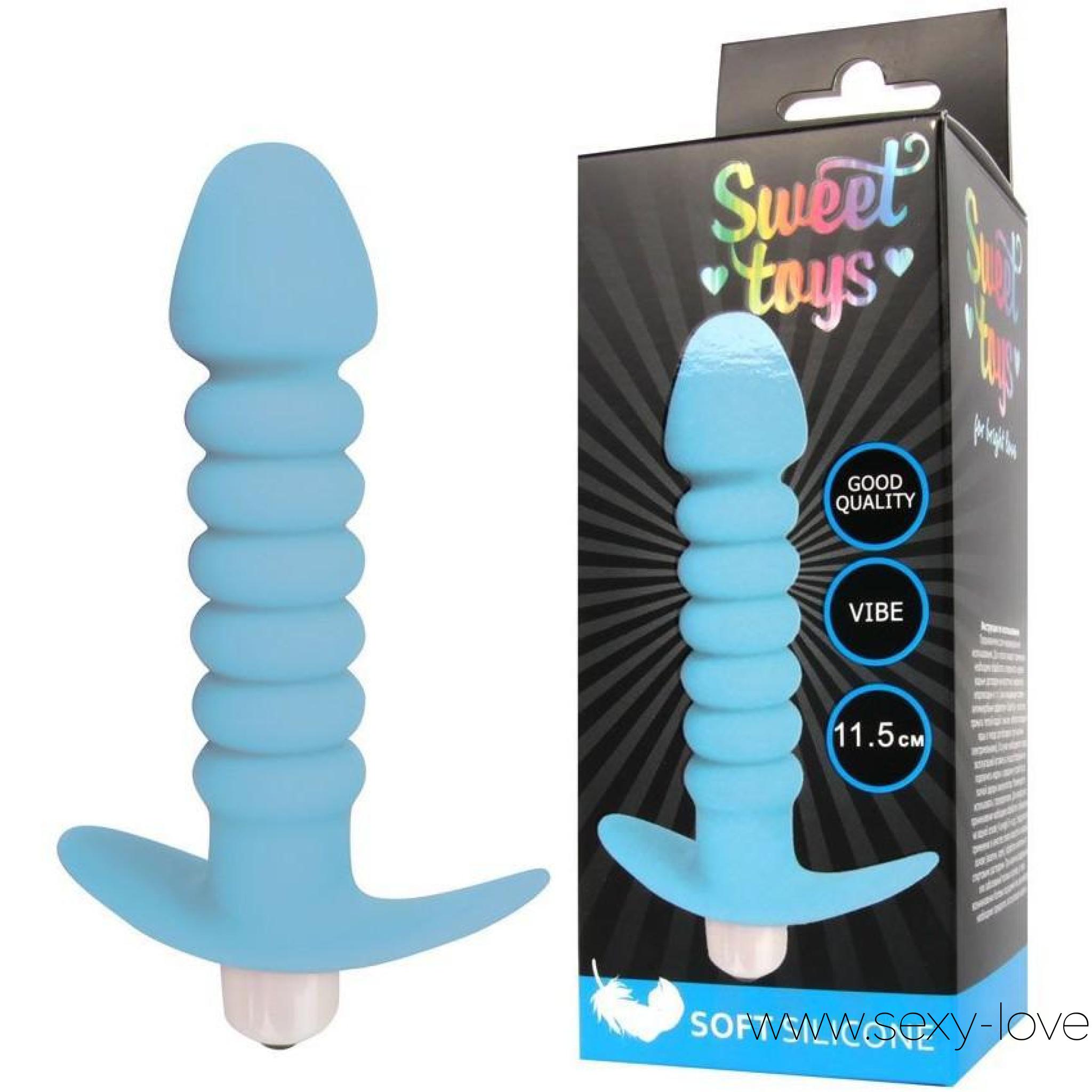 Ребристая анальная втулка с вибрацией от Sweet Toys, цвет голубой