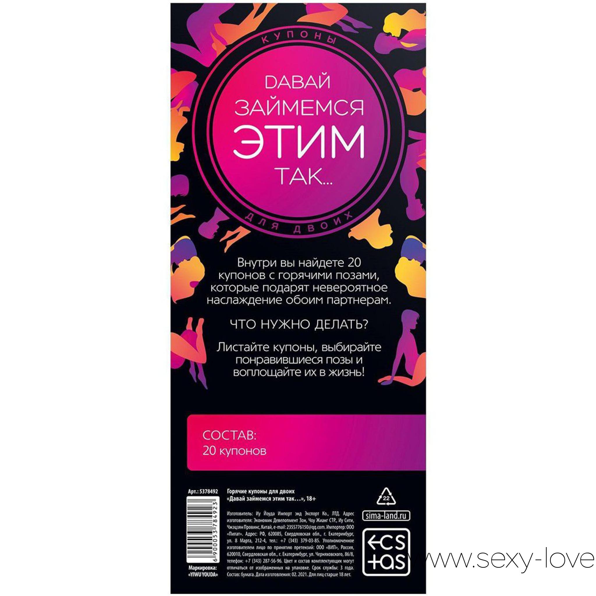 Хотите попробовать что-то новенькое и добавить в сексуальную жизнь перчинки? Тогда эти купоны — именно то, что вам нужно. Внутри вас ждут 20 самых горячих и соблазнительных поз, которые подарят наслаждение обоим партнёрам.