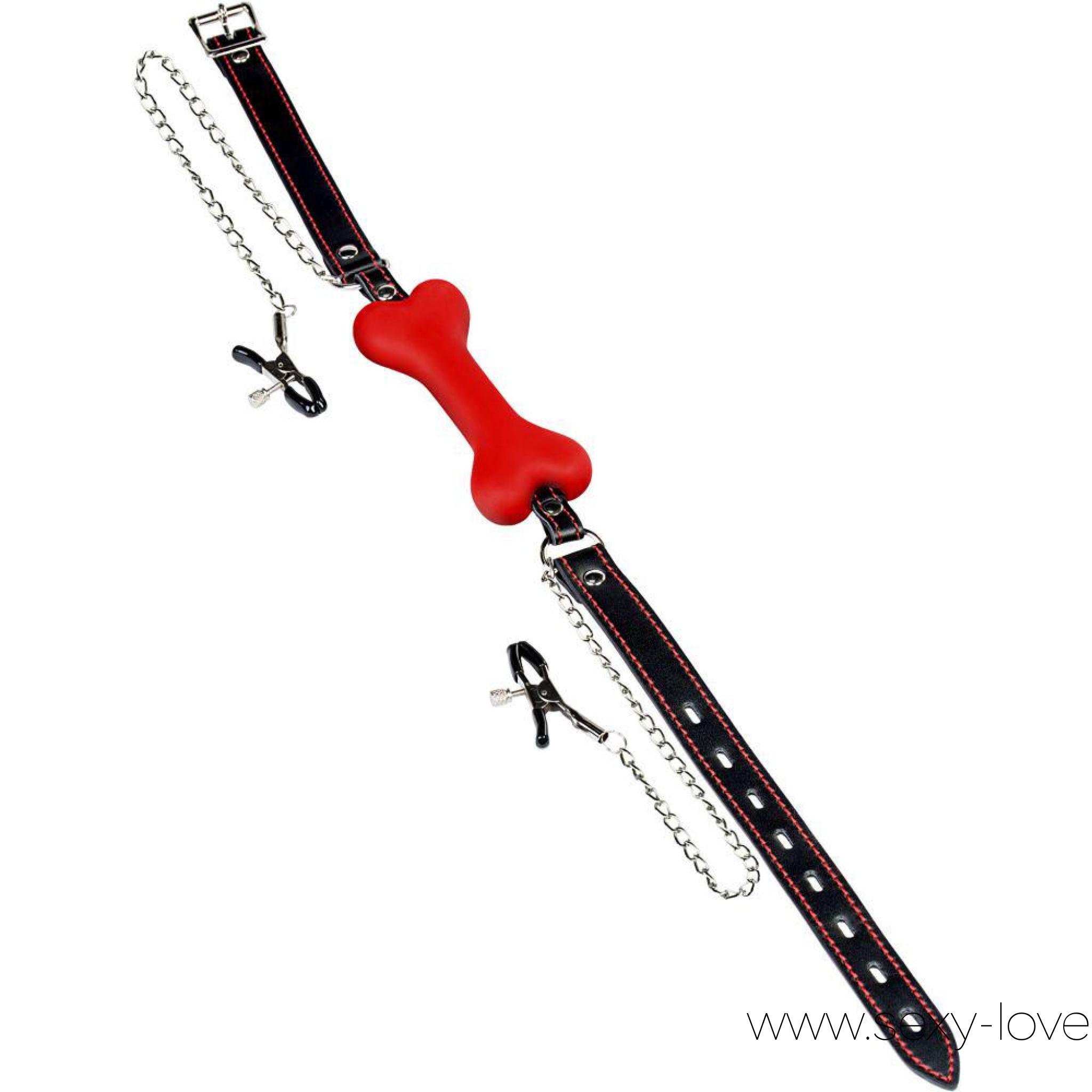 Кляп-трензель в виде косточки с зажимами для сосков, цвет красный