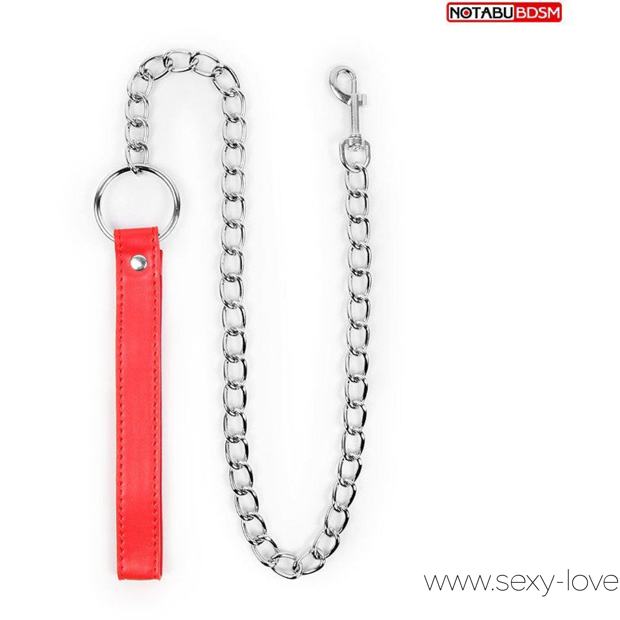 Поводок-цепь металлический с карабином и красной ручкой-петлей, цвет серебристый